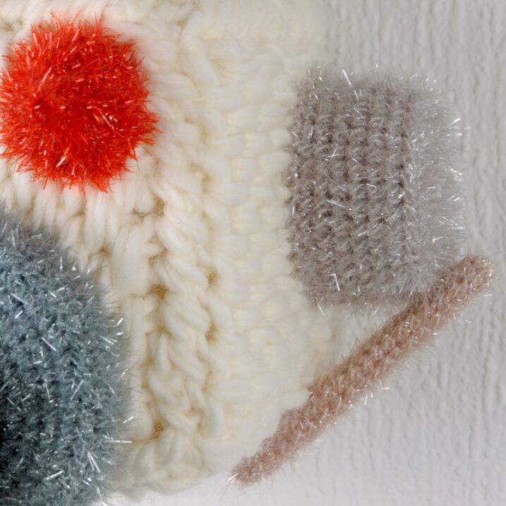 キラキラの毛糸で編まれた壁掛け作品です。