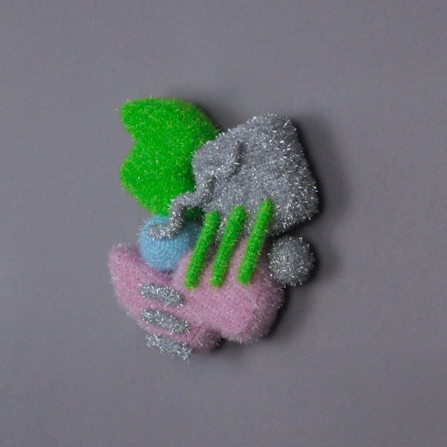 A wall sculpture crocheted with glittery yarn.