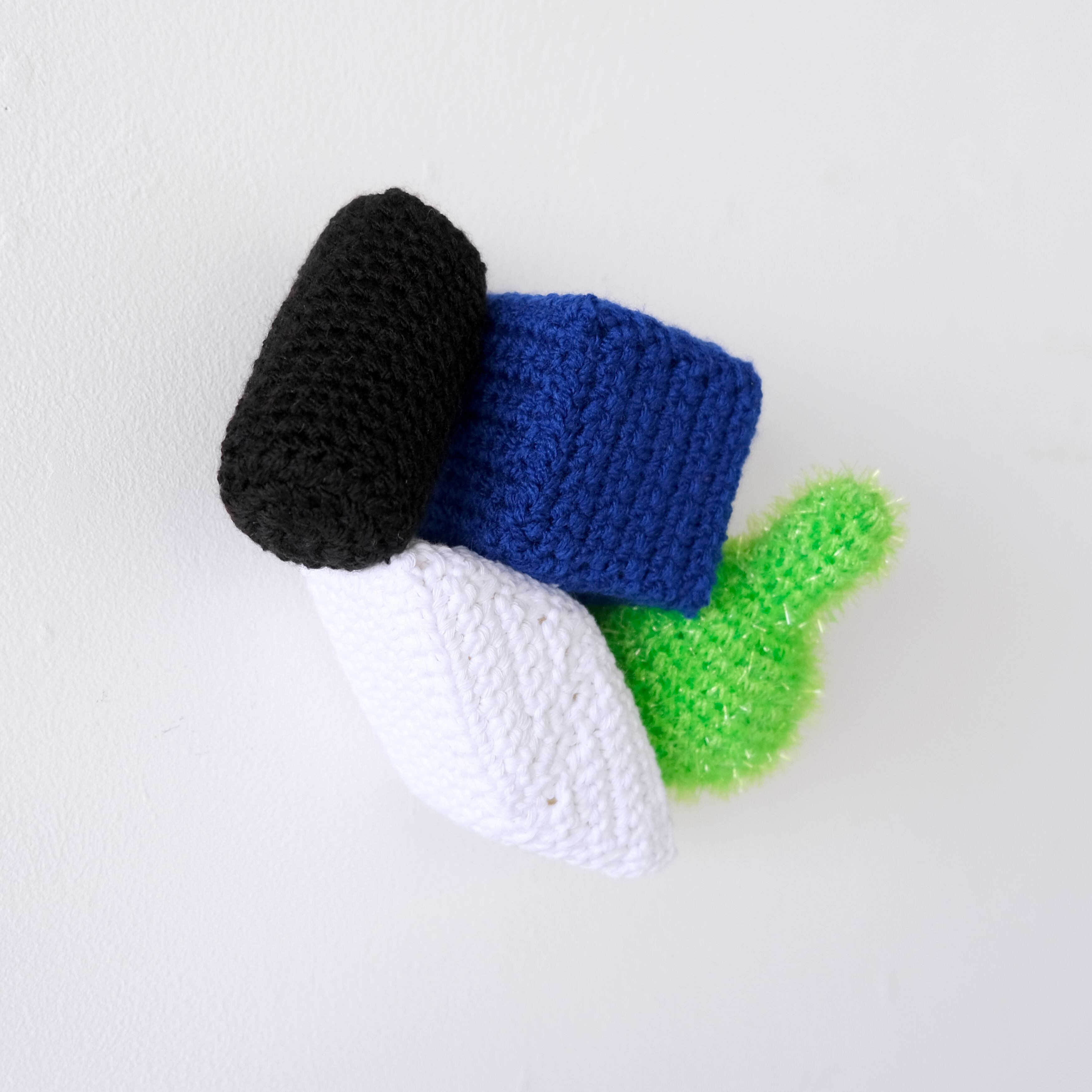 10種類の形を8つの色と3種類の毛糸素材で編みました。それぞれ組み合わされる形の数によって作品の姿は変わります。同じものはひとつもありません。数によって形が変わる。とても単純で当然の仕組みですが、そこにフォーカスすることによって新しい表現の可能性を模索することができました。