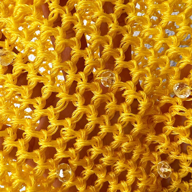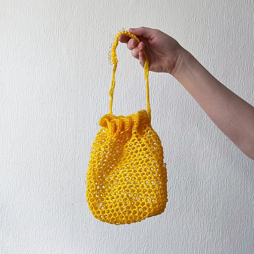 ナイロン素材の毛糸で編んだ巾着バッグです。